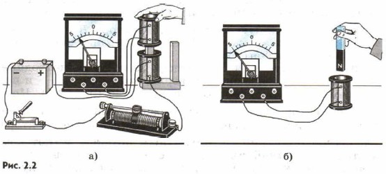 § 8. Открытие электромагнитной индукции Явление электромагнитной индукцииЯвление электромагнитной индукции заключается в возникновении электрического тока в проводящем контуре, который либо покоится в переменном во времени магнитном поле, либо движется в постоянном магнитном поле таким образом, что число линий магнитной индукции, пронизывающих контур, меняется. Это явление было открыто 29 августа 1831 г. Редкий случай, когда дата нового замечательного открытия известна так точно! Сначала Фарадеем была открыта электромагнитная индукция в неподвижных относительно друг друга проводниках при замыкании и размыкании цепи. Затем, ясно понимая, что сближение или удаление проводников с током должно приводить к тому же результату, что и замыкание и размыкание цепи, Фарадей с помощью опытов доказал: ток возникает при перемещении катушек относительно друг друга. Знакомый с трудами Ампера, Фарадей понимал, что магнит — это совокупность маленьких токов, циркулирующих в молекулах. 17 октября, как зарегистрировано в его лабораторном журнале, был обнаружен индукционный ток в катушке во время введения (или удаления) магнита. В течение одного месяца Фарадей опытным путем установил все главные особенности явления электромагнитной индукции. В настоящее время опыты Фарадея может повторить каждый. Для этого надо иметь две катушки, магнит, батарею элементов и достаточно чувствительный гальванометр. В установке, изображенной на рисунке 2.1, а, индукционный ток возникает в одной из катушек в момент замыкания или размыкания электрической цепи другой катушки, неподвижной относительно первой. В других опытах индукционный ток возникает при изменении силы тока в одной из катушек с помощью реостата (рис. 2.1, б), при движении катушек относительно друг друга (рис. 2.2, а), при движении постоянного магнита относительно катушки (рис. 2.2, б).