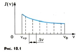 Глава 10. Излучение и спектры § 81. Спектры и спектральные аппаратыРаспределение энергии в спектреНи один из источников не дает монохроматического света, т. е. света строго определенной длины волны. В этом нас убеждают опыты по разложению света в спектр с помощью призмы, а также опыты по интерференции и дифракции. Та энергия, которую несет с собой свет от источника, определенным образом распределена по волнам всех длин волн (или частотам), входящим в состав светового пучка. Плотность потока электромагнитного излучения, или интенсивность I, как известно из § 50, определяется энергией ΔW, приходящейся на все частоты. Для характеристики распределения излучения по частотам нужно ввести новую величину: интенсивность, приходящуюся на единичный интервал частот. Эту величину называют спектральной плотностью потока излучения. Обозначим ее через I(ν). Тогда интенсивность излучения, приходящаяся на небольшой спектральный интервал Δv, равна I(ν)Δν. Суммируя подобные выражения по всем частотам спектра, мы получим плотность потока излучения I. Спектральную плотность потока излучения на разных частотах можно найти экспериментально. Для этого надо с помощью призмы получить спектр излучения, например электрической дуги, и измерить плотность потока излучения, приходящегося на небольшие спектральные интервалы шириной Δν. Зрительно оценить (приблизительно) распределение энергии нельзя, так как глаз обладает избирательной чувствительностью к свету: максимум его чувствительности лежит в желто-зеленой области спектра. Лучше всего воспользоваться свойством очень черного тела почти полностью поглощать свет всех длин волн. При этом энергия излучения (т. е. света) вызывает нагревание тела. Поэтому достаточно измерить температуру тела и по ней судить о количестве поглощенной в единицу времени энергии. По результатам таких опытов можно построить кривую зависимости спектральной плотности интенсивности излучения от частоты (рис. 10.1). Эта кривая даст наглядное представление о распределении энергии в видимой части спектра электрической дуги.