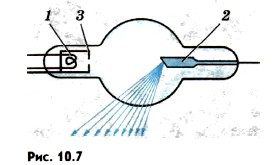 На рисунке 10.7 изображена упрощенная схема электронной рентгеновской трубки. Катод 1 представляет собой вольфрамовую спираль, испускающую электроны за счет термоэлектронной эмиссии. Цилиндр 3 фокусирует поток электронов, которые затем соударяются с металлическим электродом (анодом) 2. При этом появляются рентгеновские лучи. Напряжение между анодом и катодом достигает нескольких десятков киловольт. В трубке создается глубокий вакуум; давление газа в ней не превышает 10-5 мм рт. ст. В мощных рентгеновских трубках анод охлаждается проточной водой, так как при торможении электронов выделяется большое количество теплоты. В полезное излучение превращается лишь около 3% энергии электронов. Гамма-лучиПо своим свойствам γ-лучи очень сильно напоминают рентгеновские, но только их проникающая способность гораздо больше, чем γ рентгеновских лучей. Это наводило на мысль, что γ-лучи представляют собой электромагнитные волны. Все сомнения в этом отпали после того, как была обнаружена дифракция γ-лучей на кристаллах и измерена их длина волны. Она оказалась очень малой — от 10-8 до 10-11 см. На шкале электромагнитных волн γ-лучи следуют непосредственно за рентгеновскими. Скорость распространения γ-лучей такая же, как у всех электромагнитных волн, — около 300 000 км/с. Рентгеновское излучение широко используется в медицине, для научных исследований. Рентгеновские лучи, как и γ-излучение — электромагнитные волны с малой длиной волны. Вопросы к параграфу 1. Как устроена рентгеновская трубка? 2. Почему трудно изготовить рентгеновский микроскоп?