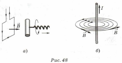 Если проводник смотан в катушку, то магнитное поле, создаваемое катушкой с током, представляет собой результат суперпозиции (сложения) магнитных полей, создаваемых отдельными её витками. Конфигурация линий магнитной индукции поля катушки с током аналогична конфигурации линий магнитной индукции полосового постоянного магнита. Направление линий магнитной индукции поля катушки с током определяется по правилу буравчика, так же как и направление вектора магнитной индукции поля рамки с током. Вектор магнитной индукции в любой точке поля направлен по касательной к линии магнитной индукции (см. рис. 48, б).
