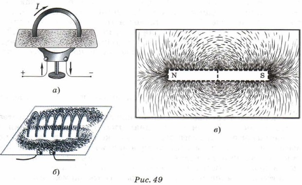 Картину магнитных полей можно получить с помощью магнитных стрелок или железных опилок. На рисунке 49, а показано магнитное поле, созданное проводником с током, имеющим форму витка, на рисунке 49, б — катушки с током. Картина магнитного поля полосового магнита показана на рисунке 49, в.