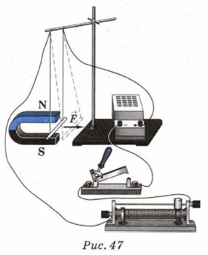 При прохождении тока по проводнику он будет в зависимости от направления тока втягиваться в магнитное поле или выталкиваться из него. Измерить силу, действующую на проводник, можно по углу отклонения нитей, на которых подвешен проводник. Изменяя силу тока и длину проводника, можно убедиться в том, что отношение действующей на него силы к силе тока и длине активной части проводника, находящейся в магнитном поле, постоянно; оно не зависит от силы тока и длины проводника.