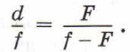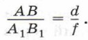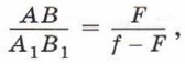 Формула линзы4. Получим выражение, связывающее три величины: расстояние d от предмета до линзы, расстояние ƒ от линзы до изображения и фокусное расстояние линзы F. Построим изображение предмета в собирающей линзе (рис. 104) и рассмотрим два треугольника АОВ и А1ОВ1. Эти треугольники подобны, так как имеют равные углы. Запишем отношение соответствующих сторон: