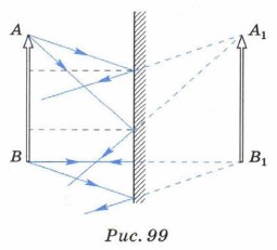 Глава 4. Оптика § 27. Ход лучей в зеркалах, призмах и линзахИзображение предмета в плоском зеркале1. В курсе физики основной школы вы научились строить изображение предмета в плоском зеркале. Напомним, что для построения изображения точки в зеркале достаточно рассмотреть два луча расходящегося пучка света. Изображение предмета имеет те же размеры, что и предмет, и находится на том же расстоянии от зеркала, что и предмет (рис. 99).