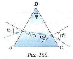В область пространства за зеркалом свет не проникает, т. е. в неё не поступает энергия света. Изображение предмета в зеркале формирует глаз, собирая расходящийся световой пучок. Ход лучей в призме2. Рассмотрим преломление света призмой. На рисунке 100 показано сечение трёхгранной призмы плоскостью, перпендикулярной её боковым рёбрам — треугольник АВС. Угол φ между гранями призмы, на которых происходит преломление света, называют преломляющим углом призмы.