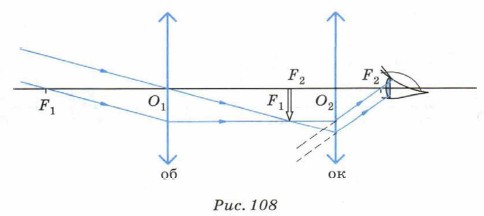 Глава 4. Оптика Оптические приборыТелескоп3. Как вы знаете, телескоп — прибор, используемый для астрономических наблюдений. Существуют различные типы телескопов: зеркальный (телескоп-рефлектор), линзовый (телескоп-рефрактор), радиотелескоп. Рассмотрим принцип работы телескопа-рефрактора. Оптическая система телескопа-рефрактора состоит из объектива и окуляра (рис. 108). Поскольку астрономические объекты находятся на большом расстоянии от телескопа, то можно считать, что в объектив попадает параллельный пучок света, он соберётся в фокальной плоскости объектива. Линза объектива имеет большое фокусное расстояние F1.