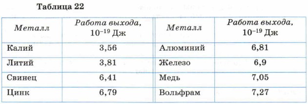 Предельная частота определяет красную границу фотоэффекта, значение которой у разных веществ различно. Отсутствие запаздывания возникновения фотоэффекта после начала освещения пластины также объясняется исходя из представления о том, что свет — это поток фотонов: фотон, достигший пластины, практически мгновенно может передать свою энергию электрону и освободить его из вещества. Поскольку структура атомов различных металлов разная, работа выхода у разных веществ тоже будет разная (табл. 22).