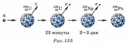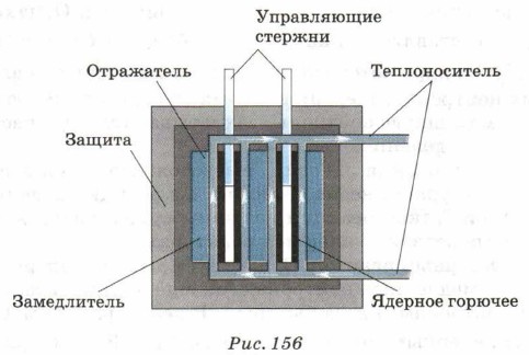 На рисунке 156 показана схема реактора на медленных нейтронах. Урановые стержни, запрессованные в стальные цилиндры, опускаются в воду или, в зависимости от конструкции, в графит, жидкий металл и др. Подобная среда является замедлителем нейтронов. Урановые стержни и замедлитель нейтронов составляют активную зону реактора. Масса каждого стержня значительно меньше критической, поэтому цепная реакция в каждом отдельном стержне произойти не может. Управление цепной ядерной реакцией осуществляется с помощью стержней, изготовленных из материалов, сильно поглощающих нейтроны (кадмий или бор). При введении стержней в активную зону, содержащую ядерное горючее, нейтроны поглощаются, и реакция деления подавляется; при выведении стержней реакция идёт интенсивнее.