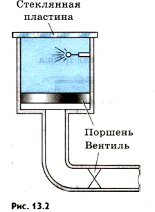 Камера Вильсона представляет собой герметически закрытый сосуд, заполненный парами воды или спирта, близкими к насыщению (рис. 13.2). При резком опускании поршня, вызванном уменьшением давления под ним, пар в камере адиабатно расширяется. Вследствие этого происходит охлаждение, и пар становится перенасыщенным. Это — неустойчивое состояние пара: он легко конденсируется, если в сосуде появляются центры конденсации. Центрами конденсации становятся ионы, которые образует в рабочем пространстве камеры пролетевшая частица. Если частица проникает в камеру сразу после расширения пара, то на ее пути появляются капельки воды. Эти капельки образуют видимый след пролетевшей частицы — трек (рис. 13.3). Затем камера возвращается в исходное состояние, и ионы удаляются электрическим полем. В зависимости от размеров камеры время восстановления рабочего режима варьируется от нескольких секунд до десятков минут.
