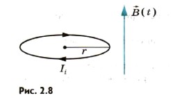 Глава 2. Электромагнитная индукция § 12. Вихревое электрическое полеМагнитный поток Ф = BS cos α. Изменение магнитного потока через контур может происходить: 1) в случае неподвижного проводящего контура, помещенного в изменяющееся во времени поле; 2) в случае проводника, движущегося в магнитном поле, которое может и не меняться со временем. Значение ЭДС индукции в обоих случаях определяется законом (2.4), но происхождение этой ЭДС различно. Рассмотрим сначала первый случай возникновения индукционного тока. Поместим круговой проволочный виток радиусом r в переменное во времени однородное магнитное поле (рис. 2.8). Пусть индукция магнитного поля увеличивается, тогда будет увеличиваться со временем и магнитный поток через поверхность, ограниченную витком. Согласно закону электромагнитной индукции в витке появится индукционный ток. При изменении индукции магнитного поля по линейному закону индукционный ток будет постоянен. Какие же силы заставляют заряды в витке двигаться? Само магнитное поле, пронизывающее катушку, этого сделать не может, так как магнитное поле действует исключительно на движущиеся заряды (этим-то оно и отличается от электрического), а проводник с находящимися в нем электронами неподвижен. Кроме магнитного поля, на заряды, причем как на движущиеся, так и на неподвижные, действует еще электрическое поле. Но ведь те поля, о которых пока шла речь (электростатическое или стационарное), создаются электрическими зарядами, а индукционный ток появляется в результате действия меняющегося магнитного поля. Поэтому можно предположить, что электроны в неподвижном проводнике приводятся в движение электрическим полем и это поле непосредственно порождается меняющимся магнитным полем. Тем самым утверждается новое фундаментальное свойство поля: изменяясь во времени, магнитное поле порождает электрическое поле. К этому выводу впервые пришел Дж. Максвелл.