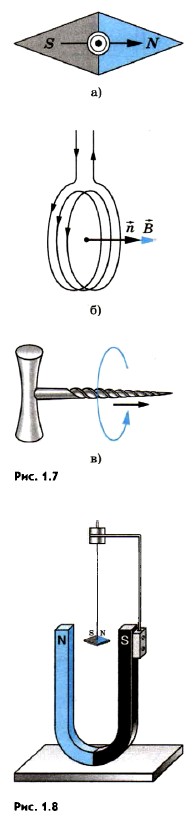 Направление вектора магнитной индукции. Ориентирующее действие магнитного поля на магнитную стрелку или рамку с током можно использовать для определения направления вектора магнитной индукции. За направление вектора магнитной индукци и принимается направление, которое показывает северный полюс N магнитной стрелки, свободно устанавливающейся в магнитном поле (рис. 1.7, а). Это направление совпадает с направлением положительной нормали к замкнутому контуру с током (рис. 1.7, б). Положительная нормаль направлена в ту сторону, куда перемещается буравчик (с правой нарезкой), если вращать его по направлению тока в рамке (рис. 1.7, в). Используя рамку с током или магнитную стрелку, можно определить направление вектора магнитной индукции в любой точке поля. На рисунках 1.8, 1.9 показаны опыты с магнитной стрелкой, повторяющие опыты с рамкой (см. рис. 1.5, 1.6). В магнитном поле прямолинейного проводника с током магнитная стрелка в каждой точке устанавливается по касательной к окружности (см. рис. 1.9). Плоскость такой окружности перпендикулярна проводу, а центр ее лежит на оси провода. Направление вектора магнитной индукции устанавливают с помощью правила буравчика: если направление поступательного движения буравчика совпадает с направлением тока в проводнике, то направление вращения ручки буравчика указывает направление вектора магнитной индукции. Опыт по определению направления вектора индукции магнитного поля Земли проводит каждый, кто ориентируется на местности по компасу.