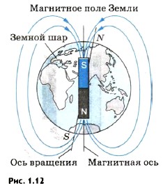 Для магнитного поля прямолинейного проводника с током из приведенных ранее опытов следует, что линии магнитной индукции — концентрические окружности, лежащие в плоскости, перпендикулярной этому проводнику с током (см. рис. 1.9). Центр окружностей находится на оси проводника. Стрелки на линиях указывают, в какую сторону направлен вектор магнитной индукции, касательный к данной линии. На рисунке 1.11 показана картина магнитного поля катушки с током (соленоида). Если длина соленоида много больше его диаметра, то магнитное поле внутри соленоида можно считать однородным. Линии магнитной индукции такого поля параллельны и находятся на равных расстояниях друг от друга. На рисунке 1.12 показано магнитное поле Земли. Линии магнитной индукции поля Земли подобны линиям магнитной индукции поля соленоида. Магнитный северный полюс N близок к Южному географическому полюсу, а магнитный южный полюс S — к Северному географическому полюсу. Ось такого большого магнита составляет с осью вращения Земли угол 11,5°. Периодически магнитные полюсы меняют свою полярность. Последняя такая замена произошла около 30 000 лет назад.