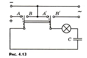 Пусть у нас имеются источники постоянного и переменного напряжений, причем постоянное напряжение на зажимах источника равно действующему значению переменного напряжения. Цепь состоит из конденсатора и лампы накаливания (рис. 4.13), соединенных последовательно. При включении постоянного напряжения (переключатель повернут влево, цепь подключена к точкам АА') лампа не светится. Но при включении переменного напряжения (переключатель повернут вправо, цепь подключена к точкам ВВ') лампа загорается, если емкость конденсатора достаточно велика. Как же переменный ток может идти по цепи, если она фактически разомкнута (между пластинами конденсатора заряды перемещаться не могут)? Все дело в том, что происходит периодическая зарядка и разрядка конденсатора под действием переменного напряжения. Ток, идущий в цепи при перезарядке конденсатора, нагревает нить лампы. Установим, как меняется со временем сила тока в цепи, содержащей только конденсатор, если сопротивлением проводов и обкладок конденсатора можно пренебречь (рис. 4.14). Напряжение на конденсаторе