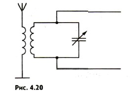 При R → 0 резонансное значение силы тока неограниченно возрастает: (Im)рез → ∞. Наоборот, с увеличением R максимальное значение силы тока уменьшается, и при больших R говорить о резонансе уже не имеет смысла. Зависимость амплитуды силы тока от частоты при различных сопротивлениях (R1 < R2 < R3) показана на рисунке 4.19. Одновременно с увеличением силы тока при резонансе резко возрастают напряжения на конденсаторе и катушке индуктивности. Эти напряжения при малом активном сопротивлении во много раз превышают внешнее напряжение. Использование резонанса в радиосвязи. Явление электрического резонанса широко используется при осуществлении радиосвязи. Радиоволны от различных передающих станций возбуждают в антенне радиоприемника переменные токи различных частот, так как каждая передающая радиостанция работает на своей частоте. С антенной индуктивно связан колебательный контур (рис. 4.20). Вследствие электромагнитной индукции в контурной катушке возникают переменные ЭДС соответствующих частот и вынужденные колебания силы тока тех же частот. Но только при резонансе колебания силы тока в контуре и напряжения в нем будут значительными, т. е. из колебаний различных частот, возбуждаемых в антенне, контур выделяет только те, частота которых равна его собственной частоте. Настройка контура на нужную частоту ω0 обычно осуществляется путем изменения емкости конденсатора. В этом обычно состоит настройка радиоприемника на определенную радиостанцию.
