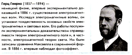 Электромагнитные волны регистрировались Герцем с помощью приемного вибратора (резонатора), представляющего собой такое же устройство, как и излучающий вибратор. Под действием переменного электрического поля электромагнитной волны в приемном вибраторе возбуждаются колебания тока. Если собственная частота приемного вибратора совпадает с частотой электромагнитной волны, наблюдается резонанс. Колебания в резонаторе происходят с большей амплитудой при расположении его параллельно излучающему вибратору. Герц обнаружил эти колебания, наблюдая искорки в очень маленьком промежутке между проводниками приемного вибратора. Ученый не только получил электромагнитные волны, но и открыл, что они ведут себя подобно другим видам волн. В частности, он наблюдал отражение электромагнитных волн от металлического листа и сложение волн. При сложении волны, идущей от вибратора, с волной, отраженной от металлического листа, образуются максимумы и минимумы амплитуды колебаний — так называемая интерференционная картина (подробнее об интерференции см. § 67—69). Если перемещать резонатор, можно найти положения максимумов и определить длину волны. Скорость электромагнитных волн. В опытах Герца длина волны составляла несколько десятков сантиметров. Вычислив собственную частоту электромагнитных колебаний вибратора, Герц смог определить скорость электромагнитной волны по формуле υ = λv. Она оказалась приближенно равной скорости света: c ≈ 300 000 км/с. Опытами Герца были блестяще подтверждены предсказания Максвелла. Для излучения электромагнитных волн нужно создать электромагнитные колебания высокой частоты в открытом колебательном контуре. Вопросы к параграфу 1. Почему обычный (закрытый) колебательный контур нельзя использовать для излучения и регистрации электромагнитных волн? 2. Чему равна скорость распространения электромагнитных взаимодействий? 3. Передающий и приемный вибраторы расположены взаимно перпендикулярно. Возникнут ли колебания в приемном вибраторе?