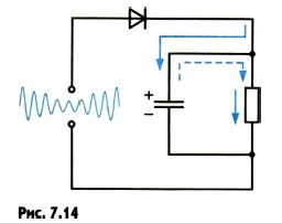 Фильтр, работает так. В те моменты времени, когда диод пропускает ток, часть его проходит через нагрузку, а другая часть тока ответвляется в конденсатор, заряжая его (сплошные стрелки на рисунке 7.14). Разветвление тока уменьшает пульсации тока, проходящего через нагрузку. Зато в промежутке между импульсами, когда диод заперт, конденсатор частично разряжается через нагрузку. Поэтому в интервале между импульсами ток через нагрузку идет в ту же сторону (штриховые стрелки на рисунке 7.14). Каждый новый импульс подзаряжает конденсатор. В результате этого через нагрузку идет ток звуковой частоты, форма колебаний которого почти точно воспроизводит форму низкочастотного сигнала на передающей станции (рис. 7.15).