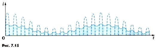 В цепи (см. рис. 7.11) будет идти пульсирующий ток, график силы тока которого показан на рисунке 7.13. Этот пульсирующий ток сглаживается с помощью фильтра. Простейший фильтр представляет собой конденсатор, присоединенный к нагрузке (рис. 7.14).