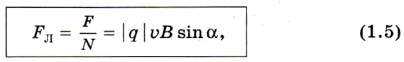 Рассмотрим отрезок тонкого прямого проводника с током (рис. 1.23). Пусть длина отрезка δl и площадь поперечного сечения проводника S настолько малы, что вектор индукции магнитного поля I = qnvS. (1.4) Модуль силы, действующей со стороны магнитного поля на выбранный элемент тока, равен: F = | I | BΔl sin α. Подставляя в эту формулу выражение (1.4) для силы тока, получаем: F = | q | nvS&ΔlB sin α = v| q | NB sin α, где N = nSΔl — число заряженных частиц в рассматриваемом объеме. Следовательно, на каждый движущийся заряд со стороны магнитного поля действует сила Лоренца, равная: