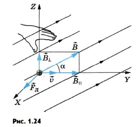 где α — угол между вектором скорости и вектором магнитной индукции. Сила Лоренца перпендикулярна векторам Электрическое поле действует на заряд q с силой Fэл = q