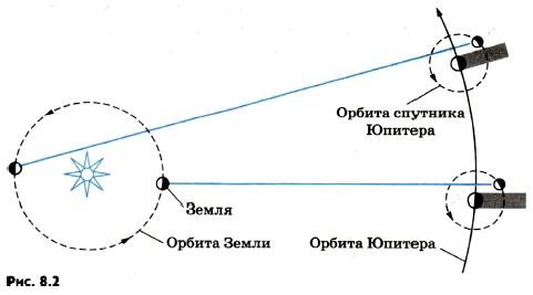 Глава 8. Световые волны § 59. Скорость светаКогда мы поворачиваем выключатель, то вся комната сразу же озаряется светом. Кажется, что свету совсем не надо времени, чтобы достигнуть стен. Предпринимались многочисленные попытки определить скорость света. Для этого пытались измерить по точным часам время распространения светового сигнала на большие расстояния (несколько километров). Но эти попытки не дали результата. Начали думать, что распространение света совсем не требует времени, что свет любые расстояния преодолевает мгновенно. Однако оказалось, что скорость света не бесконечно велика, и эта скорость была в конце концов измерена. Астрономический метод измерения скорости света. Скорость света впервые удалось измерить датскому ученому О. Рёмеру в 1676 г. Рёмер был астрономом, и его успех объясняется именно тем, что он использовал для измерений очень большие, проходимые светом расстояния. Это расстояния между планетами Солнечной системы. Рёмер наблюдал затмения спутников Юпитера — самой большой планеты Солнечной системы. Юпитер имеет четырнадцать спутников. Ближайший его спутник — Ио — стал предметом наблюдений Рёмера. Он видел, как спутник проходил перед планетой, погружался в ее тень и пропадал из поля зрения. Затем он опять появлялся, как мгновенно вспыхнувшая лампа. Промежуток времени между двумя вспышками оказался равным 42 ч 28 мин. Таким образом, эта «луна» представляла собой громадные небесные часы, через равные промежутки времени посылавшие свои сигналы на Землю. Вначале измерения проводились в то время, когда Земля при своем движении вокруг Солнца ближе всего подошла к Юпитеру (рис. 8.2). Такие же измерения, проведенные несколько месяцев спустя, когда Земля удалилась от Юпитера, неожиданно показали, что спутник опоздал появиться из тени на целых 22 мин по сравнению с моментом времени, который можно было рассчитать, зная период обращения Ио. Рёмер объяснял это так: «Если бы я мог остаться на другой стороне земной орбиты, то спутник всякий раз появлялся бы из тени в назначенное время; наблюдатель, находящийся там, увидел бы Ио на 22 мин раньше. Запаздывание в этом случае происходит оттого, что свет употребляет 22 мин на прохождение от места моего первого наблюдения до моего теперешнего положения». Зная время запаздывания появления Ио и расстояние, которым оно вызвано, можно определить скорость света, разделив это расстояние на время запаздывания. Скорость оказалась чрезвычайно большой, примерно 300 000 км/с. Потому-то крайне трудно определить время распространения света между двумя удаленными точками на Земле. Ведь за одну секунду свет проходит расстояние, большее длины земного экватора в 7,5 раза.