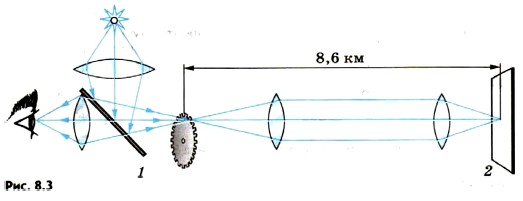 Лабораторные методы измерения скорости света. Впервые скорость света лабораторным методом удалось измерить французскому физику И. Физо в 1849 г. В опыте Физо свет от источника, пройдя через линзу, падал на полупрозрачную пластинку 1 (рис. 8.3). После отражения от пластинки сфокусированный узкий пучок направлялся на периферию быстровращающегося зубчатого колеса. Пройдя между зубцами, свет достигал зеркала 2, находящегося на расстоянии нескольких километров от колеса. Отразившись от зеркала, свет, прежде чем попасть в глаз наблюдателя, должен был пройти опять между зубцами. Когда колесо вращалось медленно, свет, отраженный от зеркала, был виден. При увеличении скорости вращения он постепенно исчезал. В чем же здесь дело? Пока свет, прошедший между двумя зубцами, шел до зеркала и обратно, колесо успевало повернуться так, что на место прорези вставал зубец, и свет переставал быть видимым. При дальнейшем увеличении скорости вращения свет опять становился видимым. Очевидно, что за время распространения света до зеркала и обратно колесо успевало в этом случае повернуться настолько, что на место прежней прорези вставала уже новая прорезь. Зная это время и расстояние между колесом и зеркалом, можно определить скорость света. В опыте Физо при расстоянии, равном 8,6 км, для скорости света было получено значение 313 000 км/с. Было разработано еще много других, более точных лабораторных методов измерения скорости света. В частности, американский физик А. Майкельсон разработал весьма совершенный метод определения скорости света с применением вращающихся зеркал. Была измерена скорость в различных прозрачных средах. Скорость света в воде была определена в 1856 г. Она оказалась в 4/3 раза меньше, чем в вакууме. Во всех других веществах она также меньше, чем в вакууме.