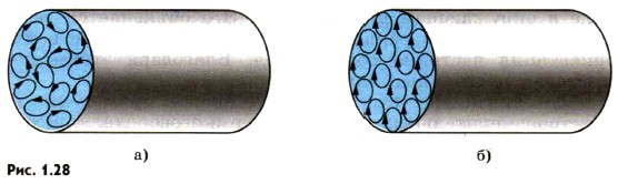 Глава 1. Магнитное поле § 7. Магнитные свойства веществаМагнитное поле создается не только электрическими токами, но и постоянными магнитами. Намагничивание вещества. Постоянные магниты могут быть изготовлены лишь из сравнительно немногих веществ, но все вещества, помещенные в магнитное поле, намагничиваются, т. е. сами становятся источниками магнитного поля. В результате этого вектор магнитной индукции при наличии вещества отличается от вектора магнитной индукции в вакууме. Гипотеза Ампера. Причина, вследствие которой тела обладают магнитными свойствами, была установлена французским ученым Ампером. Сначала, под непосредственным впечатлением от наблюдения за поворачивающейся вблизи проводника с током магнитной стрелкой в опытах Эрстеда Ампер предположил, что магнетизм Земли вызван токами, проходящими внутри земного шара. Главный шаг был сделан: магнитные свойства тела можно объяснить циркулирующими внутри него токами. Далее Ампер пришел к общему заключению: магнитные свойства любого тела определяются замкнутыми электрическими токами внутри него. Этот решающий шаг от возможности объяснения магнитных свойств тела токами к категорическому утверждению, что магнитные взаимодействия — это взаимодействия токов, — свидетельство большой научной смелости Ампера. Согласно гипотезе Ампера внутри молекул и атомов циркулируют элементарные электрические токи. (Теперь мы хорошо знаем, что эти токи образуются вследствие движения электронов в атомах.) Если плоскости, в которых циркулируют эти токи, расположены беспорядочно по отношению друг к другу из-за теплового движения молекул (рис. 1.28, а), то их действия взаимно компенсируются, и никаких магнитных свойств тело не обнаруживает. В намагниченном состоянии элементарные токи в теле ориентированы так, что их действия складываются (рис. 1.28, б). Гипотеза Ампера объясняет, почему магнитная стрелка и рамка (контур) с током в магнитном поле ведут себя одинаково (см. § 2). Стрелку можно рассматривать как совокупность маленьких контуров с током, ориентированных одинаково.