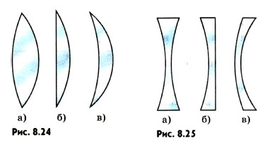 Глава 8. Световые волны § 63. ЛинзаПрозрачное тело, ограниченное сферическими поверхностями, называют линзой. Виды линз. Линза может быть ограничена двумя выпуклыми сферическими поверхностями (двояковыпуклая линза — рис. 8.24, а), выпуклой сферической поверхностью и плоскостью (плосковыпуклая линза — рис. 8.24, б), выпуклой и вогнутой сферическими поверхностями (вогнуто-выпуклая линза — рис. 8.24, в). Эти линзы посредине толще, чем у краев, и все они называются выпуклыми. Линзы, которые посредине тоньше, чем у краев, называются вогнутыми. На рисунке 8.25 изображены три вида вогнутых линз: двояковогнутая — а, плосковогнутая — б и выпукло-вогнутая — в.