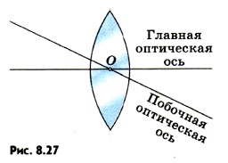 Прямую O1O2 (см. рис. 8.26), проходящую через центры сферических поверхностей, которые ограничивают линзу, называют ее главной оптической осью. Главная оптическая ось тонкой линзы проходит через оптический центр. Любую другую прямую, проходящую через оптический центр, называют побочной оптической осью (рис. 8.27). Изображение в линзе. Подобно плоскому зеркалу, линза создает изображения источников света. Это означает, что свет, исходящий из какой-либо точки предмета (источника), после преломления в линзе снова собирается в одну точку (изображение) независимо от того, через какую часть линзы прошли лучи. Если по выходе из линзы лучи сходятся, они образуют действительное изображение. В случае же, когда прошедшие через линзу лучи расходятся, то пересекаются в одной точке не сами эти лучи, а лишь их продолжения1. Изображение в этом случае мнимое. Его можно наблюдать глазом непосредственно или с помощью оптических приборов. 1 Лучи или их продолжения будут пересекаться практически в одной точке, если они образуют малые углы с главной оптической осью.