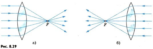 Собирающая линза. Обычно линзы изготавливают из стекла. Выпуклые линзы являются собирающими. Любую из них схематично можно себе представить как совокупность стеклянных призм (рис. 8.28). В воздухе каждая призма отклоняет лучи к основанию. Все лучи, идущие через линзу, отклоняются в сторону ее главной оптической оси. Точка, в которой пересекаются после преломления в собирающей линзе лучи, падающие на нее параллельно главной оптической оси, называется главным фокусом линзы. Эту точку обозначают буквой F (рис. 8.29, а). Пучки, параллельные главной оптической оси, можно направить на линзу и с противоположной стороны. Точка, в которой они сойдутся, пройдя линзу, будет другим главным фокусом (рис. 8.29, б).