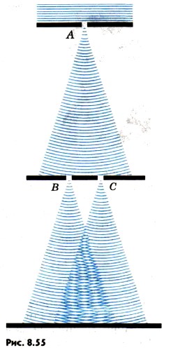 Опыт Юнга. В 1802 г. Т. Юнг, открывший интерференцию света, поставил классический опыт по дифракции (рис. 8.55). В непрозрачной ширме он проколол булавкой два маленьких отверстия В и С на небольшом расстоянии друг от друга. Эти отверстия освещались узким световым пучком, прошедшим через малое отверстие А в другой ширме. Именно эта деталь, до которой очень трудно было додуматься в то время, решила успех опыта. Интерферируют ведь только когерентные волны. Возникшая в соответствии с принципом Гюйгенса сферическая волна от отверстия Л возбуждала в отверстиях В и С когерентные колебания. Вследствие дифракции от отверстий В и С выходили два световых конуса, которые частично перекрывались. В результате интерференции этих двух световых волн на экране появлялись чередующиеся светлые и темные полосы. Закрывая одно из отверстий, Юнг обнаружил, что интерференционные полосы исчезали. Именно с помощью этого опыта впервые Юнгом были измерены длины волн, соответствующие световым лучам разного цвета, причем весьма точно. Теория Френеля. Исследование дифракции было завершено в работах О. Френеля. Френель не только более детально исследовал различные случаи дифракции на опыте, но и разработал количественную теорию дифракции, позволяющую в принципе рассчитать дифракционную картину, возникающую при огибании светом любых препятствий. Им же было впервые объяснено прямолинейное распространение света в однородной среде на основе волновой теории. Этих успехов Френель добился, объединив принцип Гюйгенса с идеей интерференции вторичных волн. Согласно идее Френеля каждая точка волнового фронта является источником вторичных волн, причем все вторичные источники когерентны (принцип Гюйгенса — Френеля).