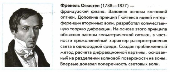 Любопытный случай произошел на заседании Французской академии наук в 1818 г. Один из ученых, присутствовавших на заседании, обратил внимание на то, что из теории Френеля вытекают факты, явно противоречащие здравому смыслу. Так, при определенных размерах отверстия и определенных расстояниях от отверстия до источника света и экрана в центре светлого пятна должно находиться темное пятнышко. А за маленьким непрозрачным диском, наоборот, должно находиться светлое пятно в центре тени. Каково же было удивление ученых, когда поставленные эксперименты доказали, что так и есть на самом деле! Границы применимости геометрической оптики. Все физические теории отражают происходящие в природе процессы лишь приближенно. Для любой теории могут быть указаны определенные границы ее применимости. Можно ли применять в конкретном случае данную теорию или нет, зависит не только от той точности, которую обеспечивает эта теория, но и от того, какая точность требуется при решении той или иной практической задачи. Границы применимости теории можно установить лишь после того, как разработана более общая теория, охватывающая те же явления. Все эти общие положения относятся и к геометрической оптике. Эта теория является приближенной. Она неспособна объяснить, например, явления интерференции и дифракции света. Более общей и более точной теорией является волновая оптика. Согласно ей, закон прямолинейного распространения света и другие законы геометрической оптики выполняются достаточно точно лишь в том случае, если размеры препятствий на пути распространения света много больше длины световой волны. Но совершенно точно они не выполняются никогда. Действие оптических приборов описывается законами геометрической оптики. Согласно этим законам можно различать с помощью микроскопа сколь угодно малые детали объекта; с помощью телескопа можно установить существование двух звезд при любых малых угловых расстояниях между ними. Однако в действительности это не так, и лишь волновая теория света позволяет разобраться в причинах предела разрешающей способности оптических приборов. Разрешающая способность микроскопа и телескопа. Волновая природа света налагает предел на возможность различать детали предмета или очень мелкие предметы при их наблюдении с помощью микроскопа. Дифракция не позволяет получить отчетливые изображения мелких предметов, так как свет распространяется не строго прямолинейно, а огибает предметы. Из-за этого изображения получаются размытыми. Это происходит, когда линейные размеры предметов меньше длины световой волны. Дифракция также налагает предел на разрешающую способность телескопа. Вследствие дифракции волн у края оправы объектива изображением звезды будет не точка, а система светлых и темных колец. Если две звезды находятся на малом угловом расстоянии друг от друга, то эти кольца налагаются друг на друга, и глаз не может различить, имеются ли две светящиеся точки или одна. Предельное угловое расстояние между светящимися точками, при котором их можно различать, определяется отношением длины волны к диаметру объектива. Этот пример показывает, что с дифракцией приходится считаться всегда, при любых препятствиях. Ею при очень тщательных наблюдениях нельзя пренебрегать и в случае препятствий, размеры которых значительн