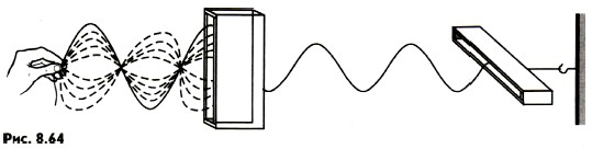 Это предположение полностью объясняет результаты второго опыта. Из первого кристалла выходит плоскопо- ляризованная волна. При скрещенных кристаллах (угол между их осями 90°) она не проходит сквозь второй кристалл. Если оси кристаллов составляют между собой некоторый угол, отличный от 90°, то проходят колебания, амплитуда которых равна проекции амплитуды волны, прошедшей через первый кристалл, на направление оси второго кристалла. Итак, кристалл турмалина преобразует естественный свет в плоскополяризованный. Механическая модель опытов с турмалином. Нетрудно построить простую наглядную механическую модель рассматриваемого явления. Можно получить поперечную волну в резиновом шнуре так, чтобы колебания быстро меняли свое направление в пространстве. Это аналог естественной световой волны. Пропустим теперь шнур сквозь узкий деревянный ящик (рис. 8.64). Из колебаний всевозможных направлений ящик «выделяет» колебания в одной определенной плоскости. Поэтому из ящика выходит поляризованная волна. Если на ее пути имеется еще точно такой же ящик, но повернутый относительно первого на 90°, то колебания сквозь него не проходят. Волна целиком гасится.