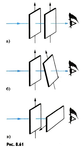 Опыты с турмалином. Рассмотрим подробно один из таких экспериментов, очень простой и эффектный. Это опыт с кристаллами турмалина (прозрачными кристаллами зеленой окраски). Кристалл турмалина принадлежит к числу так называемых одноосных кристаллов. Возьмем прямоугольную пластину турмалина, вырезанную таким образом, чтобы одна из ее граней была параллельна оси кристалла. Если направить нормально на такую пластину пучок света от электрической лампы или солнца, то вращение пластины вокруг пучка никакого изменения интенсивности света, прошедшего через нее, не вызовет (рис. 8.60). Можно подумать, что свет только частично поглотился в турмалине и приобрел зеленоватую окраску. Больше ничего, кажется, и не произошло. Но это не так. Световая волна проявила новые свои свойства.