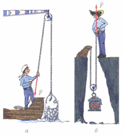 § 24. Простые механизмы Простые механизмыКак поднять груз силой, направленной вниз?На рис. 24.1, а показано, как это можно сделать: для этого используют неподвижный блок — колесо с жёлобом для троса, вращающееся на неподвижной оси. Забегая немного вперёд, скажем, что это не единственный способ поднять груз силой, направленной вниз. Как поднять груз силой, которая меньше веса груза?На рис. 24.1, б вы видите, как это можно сделать, используя подвижный блок: ось такого блока движется вместе с грузом. Как мы увидим, с помощью подвижного блока можно поднимать груз силой, которая примерно в 2 раза меньше веса груза.