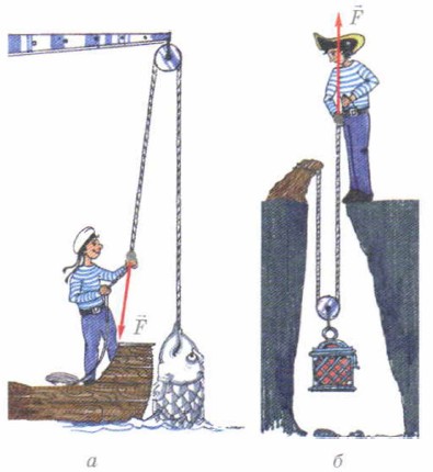 Даёт ли неподвижный блок выигрыш в силе?Рассмотрим это на примере, показанном на рис. 24.1, а. Трос натянут силой, приложенной рыбаком к свободному концу троса. Сила натяжения троса остаётся постоянной вдоль троса, поэтому со стороны троса на груз (рыбу) действует такая же по модулю сила. Следовательно,