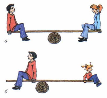Рис. 25.1. Условие равновесия качелей: а — люди равного веса уравновешивают друг друга, когда сидят на равных расстояниях от точки опоры; б — люди разного веса уравновешивают друг друга, когда более тяжёлый сидит ближе к точке опоры Перейдём теперь от наблюдений к опытам: найдём на опыте условия равновесия рычага. ПОСТАВИМ ОПЫТ