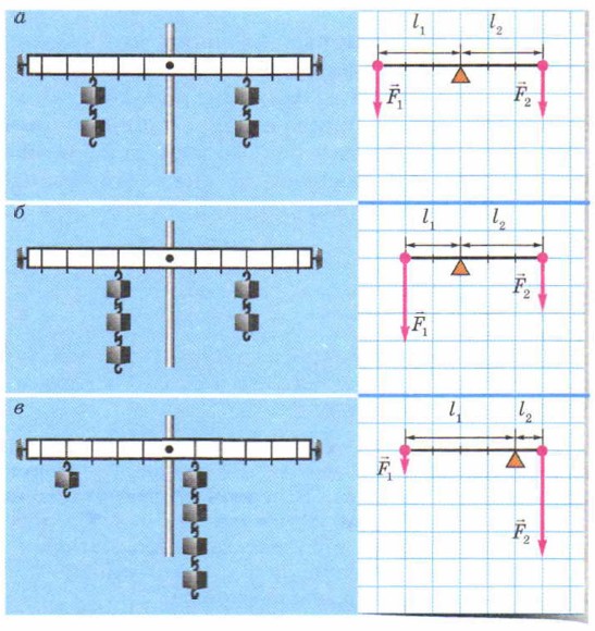 Рис. 25.2. Опыты по нахождению условия равновесия рычага Условие равновесия рычагаРасстояние от точки опоры до прямой, вдоль которой действует сила, называют плечом этой силы. Обозначим