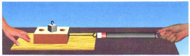 Лабораторная работа 8 Измерение коэффициента трения скольженияЦель работы: измерить коэффициент трения скольжения дерева по дереву. Оборудование: деревянный брусок, деревянная доска или линейка, набор грузов массой по 100 г, динамометр, прозрачная линейка. Ход работы 1. Измерьте динамометром вес бруска. Результат запишите. 2. Положите брусок на горизонтально расположенную деревянную линейку. На брусок поставьте груз. 3. Тяните брусок равномерно по горизонтальной доске или линейке, как показано на рисунке. Запишите показания динамометра. Повторите опыт, поставив на брусок 2 и 3 груза.