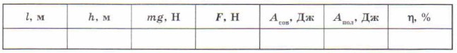 Лабораторная работа 13 Определение КПД наклонной плоскостиЦель работы: найти на опыте КПД наклонной плоскости. Оборудование: деревянная доска, деревянный брусок, динамометр, линейка, штатив. Ход работы 1. Закрепите доску под небольшим углом в штативе и измерьте высоту h и длину l наклонной плоскости. Результаты запишите. 2. Положите брусок на наклонную плоскость. Прикрепив к бруску динамометр, равномерно тяните с его помощью брусок по наклонной плоскости вверх. Запишите показания динамометра F. 3. Измерьте с помощью динамометра силу тяжести mg, действующую на брусок. Результат запишите. 4. Вычислите работу Асов = Fl, совершаемую при подъёме тела по наклонной плоскости, и полезную работу Апол = mgh при подъёме тела вертикально. Исходя из полученных результатов, найдите КПД наклонной плоскости при заданном угле её наклона: 5. Заполните в тетради для лабораторных работ таблицу: