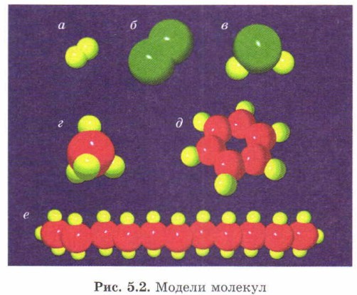 Атомы притягиваются друг к другу, вследствие чего они объединяются в молекулы. Строение молекул часто представляют с помощью моделей, где атомы различных типов изображены в виде шариков разного цвета (рис. 5.2).