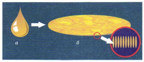 Капнем на поверхность воды маленькую каплю масла. Оно со временем растечётся по поверхности воды очень тонким слоем (рис. 5.3). Например, капелька оливкового масла объёмом 1 мм3 растекается по площади около 1 м2.