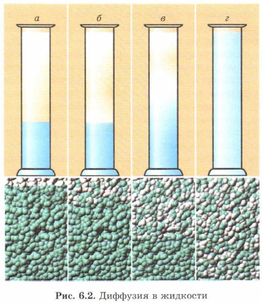 Оставим сосуд в покое и будем наблюдать за ним в течение нескольких дней. Мы заметим, что граница раздела жидкостей начнёт постепенно размываться (рис. 6.2, б, в), а через несколько недель вся жидкость в сосуде будет равномерно окрашена в бледно-голубой цвет (рис. 6.2, г). Это доказывает, что молекулы медного купороса постепенно проникают в воду, а молекулы воды — в медный купорос. Отсюда следует, что молекулы жидкости беспрестанно движутся. Взаимное проникновение частиц одного вещества в другое, обусловленное движением молекул, называют диффузией (от лат. «диффузио» — распространение, растекание).