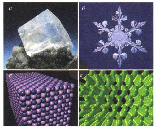 Рис. 7.6. Кристаллические тела: а — кристалл поваренной соли, б — снежинка; кристаллические решётки: в — поваренной соли, г — льда Кристаллические телаПоваренная соль, сахар и лёд являются примерами кристаллических твёрдых тел. Правильная форма кристаллов обусловлена тем, что