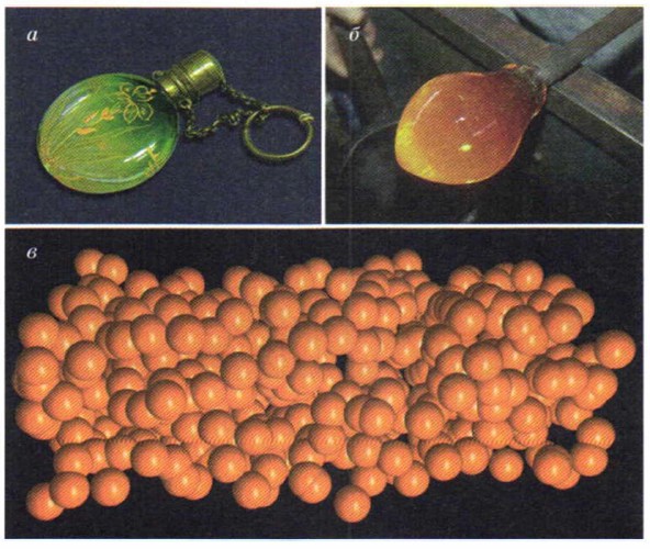Рис. 7.7. Примеры аморфных тел: а — стеклянный пузырёк; б — капля полужидкого стекла; в — схематическое изображение молекулярного строения аморфного тела