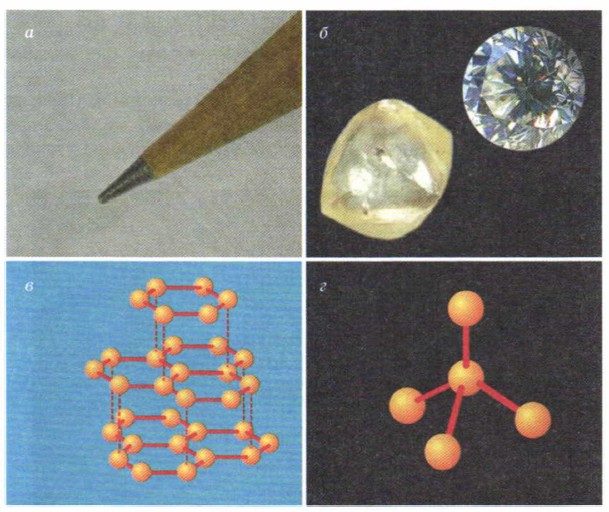 Рис. 7.8. Мягкий стержень карандаша изготовлен из графита (а); алмаз и бриллиант — огранённый алмаз (б); модели кристаллических решёток графита (в) и алмаза (г) Кристаллическая решётка графита имеет слоистую структуру, причём соседние слои сравнительно слабо связаны друг с другом (рис. 7.8, в). Этим и объясняется мягкость графита. В кристаллической же решётке алмаза все атомы «сильно» связаны со своими ближайшими соседями (рис. 7.8, г). Именно этой жёсткой связью атомов и обусловлена уникальная твёрдость алмаза.
