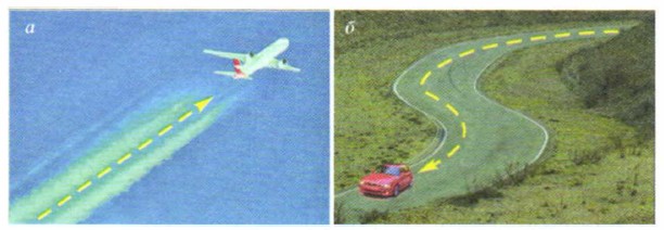 Рис. 8.2. Виды траекторий: а — прямолинейная траектория самолёта; б — криволинейная траектория автомобиля
