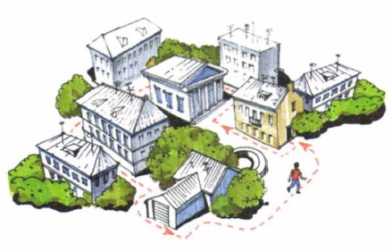 Рис. 8.3. Траектория движения человека, который вышел из дома и вернулся домой. Эта траектория — замкнутая ПутьДлину траектории называют путём, пройденным телом (часто просто путём). Путь мы будем обозначать обычно l. Как и любую длину, путь измеряют в метрах, километрах и т. д. При вычислении пути надо учитывать, что некоторые участки траектории тело может проходить несколько раз.
