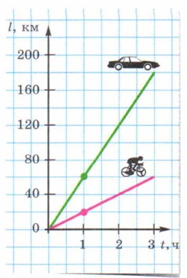 Чем отличаются графики зависимости пути от времени для тел, движущихся с разной скоростью?Рассмотрим пример. РЕШИМ ЗАДАЧУ Из посёлка одновременно выехали велосипедист и автомобиль. Скорость велосипедиста равна 20 км/ч, а скорость автомобиля равна 60 км/ч. Построим для них графики зависимости пути от времени. Р е ш е н и е. Оба графика начинаются в начале координат. Найдём для каждого графика ещё одну его точку, например соответствующую моменту времени 1 ч, и отметим её на координатной плоскости (красная точка для велосипедиста и зелёная — для автомобиля на рис. 10.2). Используя эти точки, построим искомые графики (красный и зелёный отрезки).