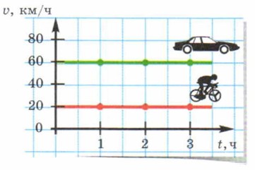 Рис. 10.3. Графики зависимости скорости от времени для автомобиля и велосипедиста Из рассмотренной задачи видно, что при прямолинейном равномерном движении график зависимости скорости от времени — отрезок прямой, параллельной оси времени.