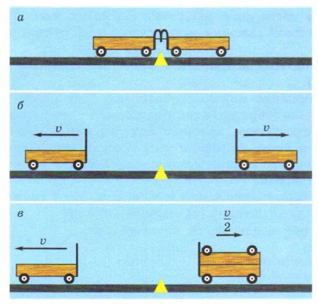 Рис. 12.3. Сравнение масс двух тележек при их взаимодействии друг с другом Повторим опыт, поместив на одну из тележек ещё одну такую же тележку. В этом случае гружёная тележка приобретёт вдвое меньшую скорость, чем пустая (рис. 12.1, в). Заметим, что и общая масса двух тележек в 2 раза больше, чем масса одной тележки! Проведённые опыты позволяют высказать гипотезу (предположение), что отношение масс двух тел обратно отношению скоростей, которые приобрели эти тела вследствие взаимодействия друг с другом. Чтобы проверить эту гипотезу, повторим опыт ещё раз, положив на гружёную тележку ещё одну пустую. Мы увидим, что гружёная тележка с тройной массой приобретёт втрое меньшую скорость, чем пустая. Таким образом, опыт подтверждает нашу гипотезу. Итак, если два покоящихся вначале тела в результате взаимодействия друг с другом приобрели скорости υ1 и υ2, то отношение масс этих тел обратно отношению их скоростей: